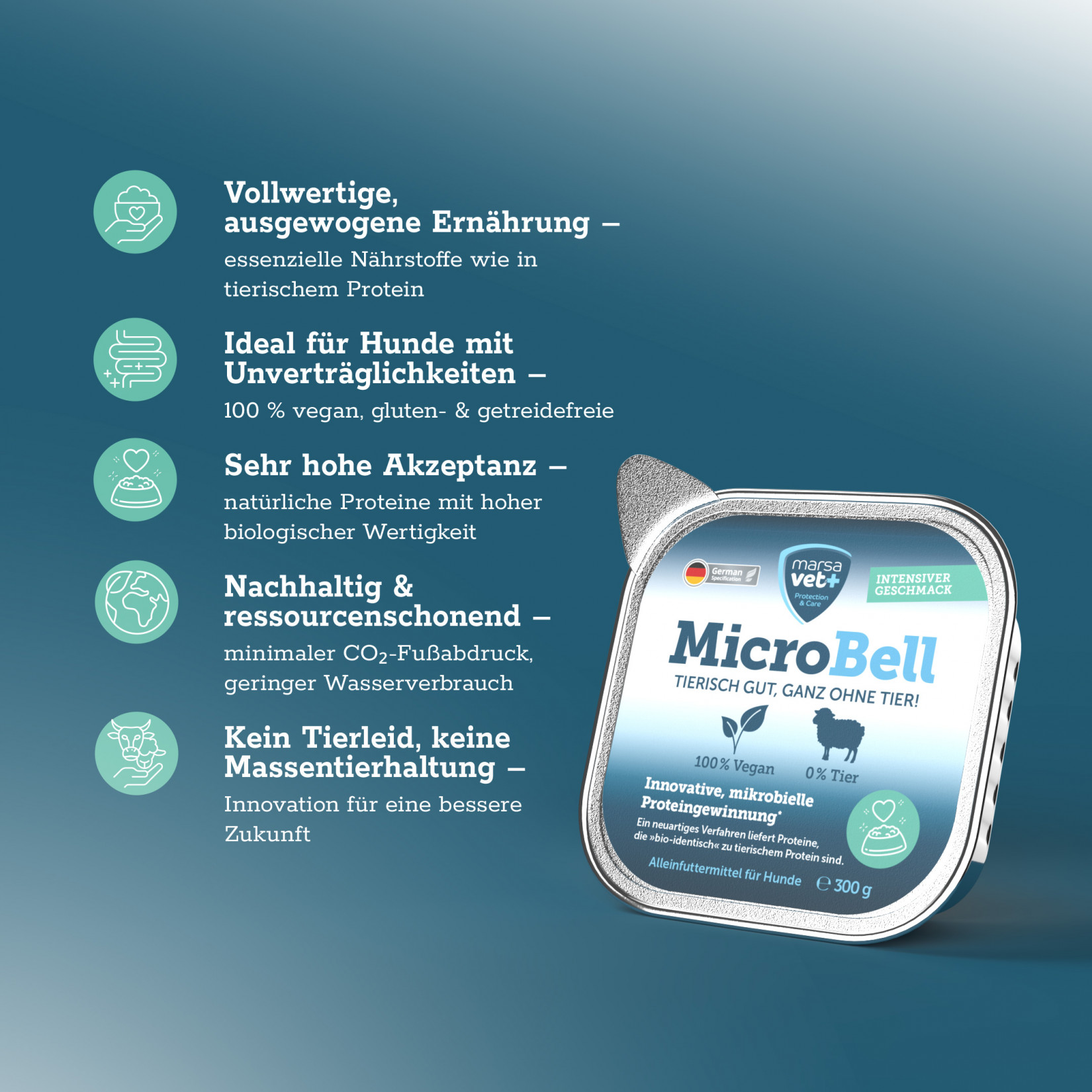 Hier sehen Sie auf einen Blick, warum Marsavet MicroBell die nächste Generation veganer Hundenahrung repräsentiert.