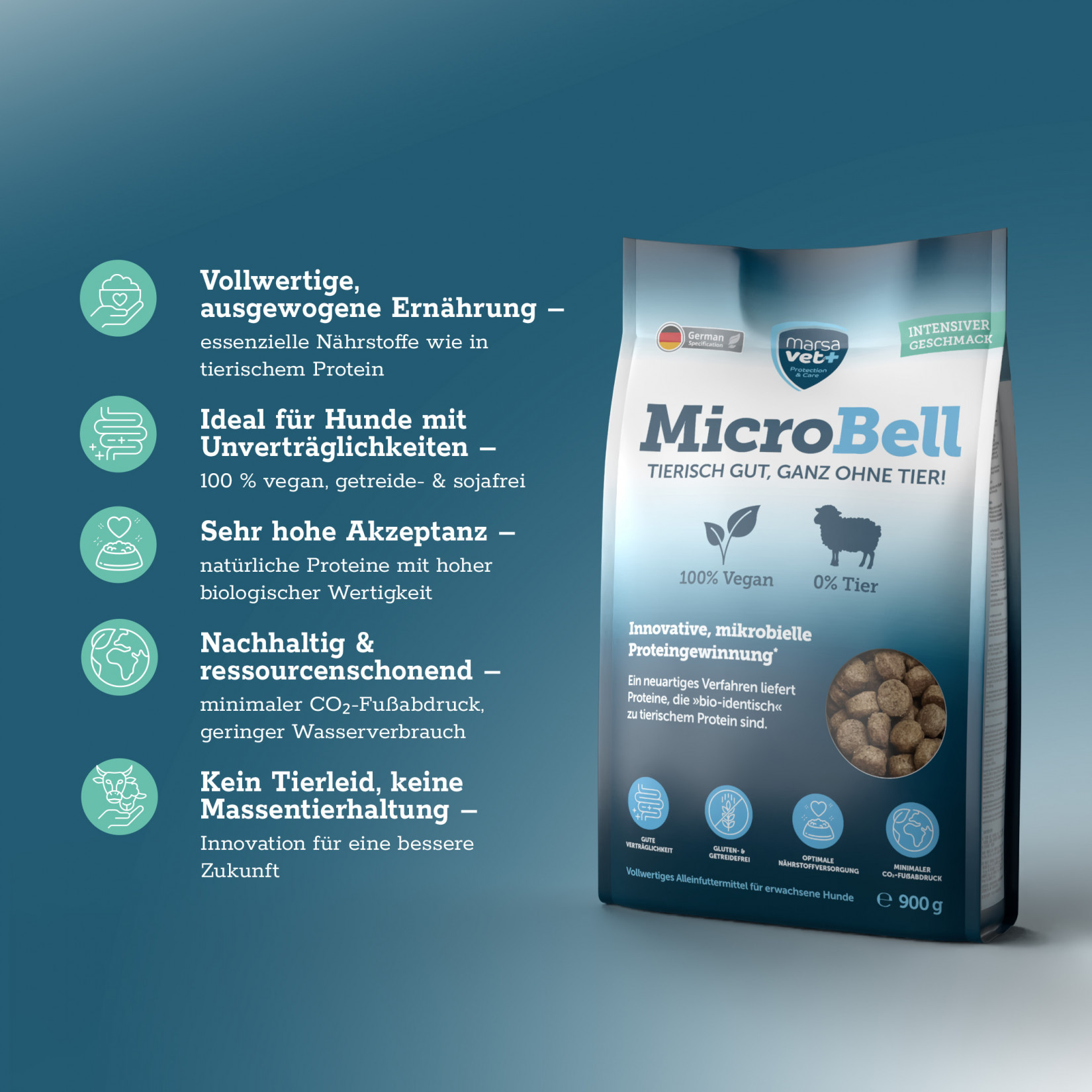 Hier sehen Sie auf einen Blick, warum Marsavet MicroBell die nächste Generation veganer Hundenahrung repräsentiert.